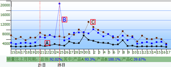 产品B于9月21日开始促销,相对于以前,终端销量明显上升,通过几天的监测和分析,B产品于25日进一步调整了市场政策,可以看到,25日开始的新政策影响很大,以至于终端上报的销量有些异常。