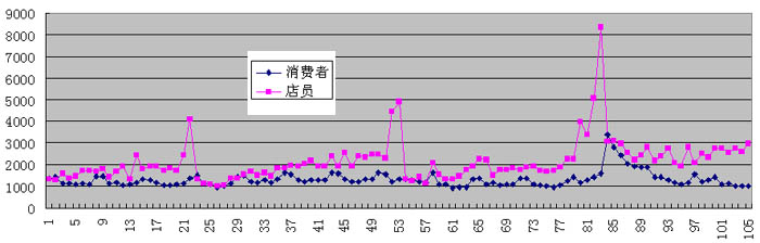在第85天左右,消费者数据也有了一个高峰(十一黄金周旺季),但是,店员数据与消费者数据增幅不成比例,因消费者数据更加符合终端销售规律,所以,判断为店员销量上报有超前和滞后的现象。从这点可以看到,店员数据是有缺陷的,它与终端市场的销售规律有偏差,如果仅依据这些数据判断本次活动效果,显然有失偏颇。