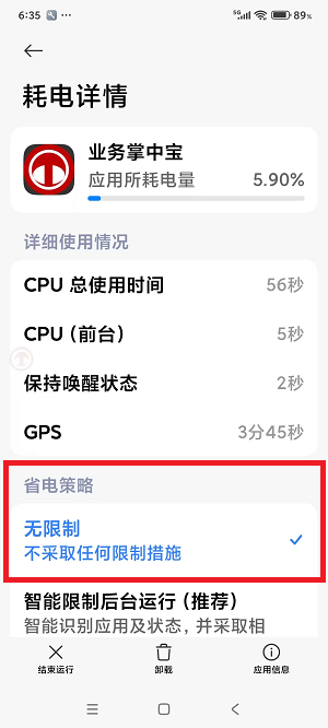 进入“业务掌中宝”后,就看到省电策略,这是针对业务掌中宝的省电策略,选择“不限制”。