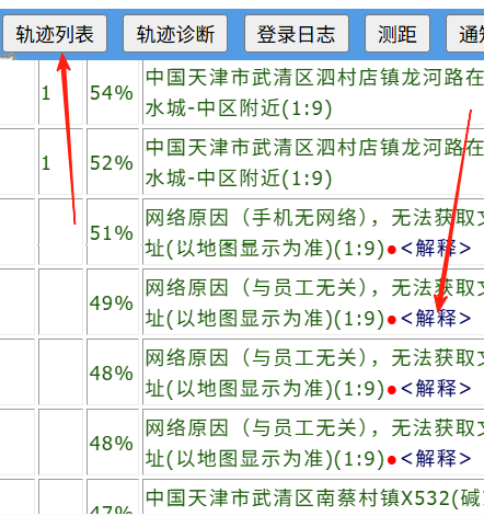 管理人员登录电脑,选择“考勤管理-业务轨迹-看员工轨迹-点轨迹列表按钮”,下拉,在没有地址文字的行,有解释,如下图: