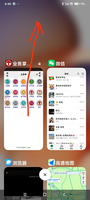 安卓不同手机可能有差别,但都是在多任务页面,按住业务掌中宝划出屏幕(如下图是小米手机):
